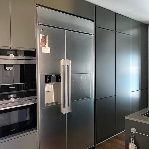 빌트인 냉장고가 있던 자리는 바닥이 비어 있는 상태인데 기존에 가지고 계신 스피드렉과 같은 선반을 설치해서 사용하기로 했습니다.김치냉장고와 일반냉장고 사이 공간에 히든판을 시공해 냉장고가 설치됐을 때 최대한 빌트인 같은 깔끔한 느낌을 줄 수 있도록 했습니다.